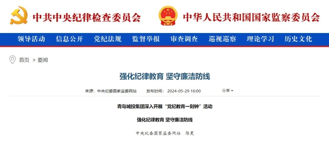 中央紀委國家監(jiān)委網(wǎng)站:強化紀律教育 堅守廉潔防線 青島城投集團深入開展“黨紀教育一刻鐘”活動