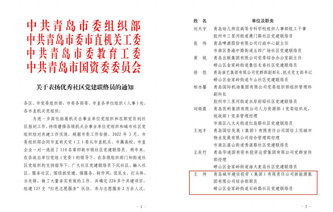 近日,市委組織部、市直機(jī)關(guān)工委、市委教育工委、市國(guó)資委四部門聯(lián)合行文《關(guān)于表?yè)P(yáng)優(yōu)秀社區(qū)黨建聯(lián)絡(luò)員的通知》對(duì)青島城投新能源集團(tuán)王帥同志等55名優(yōu)秀社區(qū)黨建聯(lián)絡(luò)員進(jìn)行了表彰。2022年以來(lái),城投集團(tuán)與金家?guī)X街道石嶺路社區(qū)開展黨建結(jié)對(duì)共建“雙報(bào)到”,本次表彰再次體現(xiàn)了有關(guān)部門對(duì)集團(tuán)黨建共建工作的高度評(píng)價(jià)。